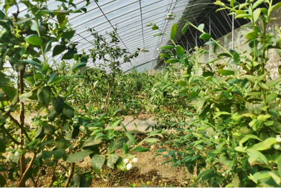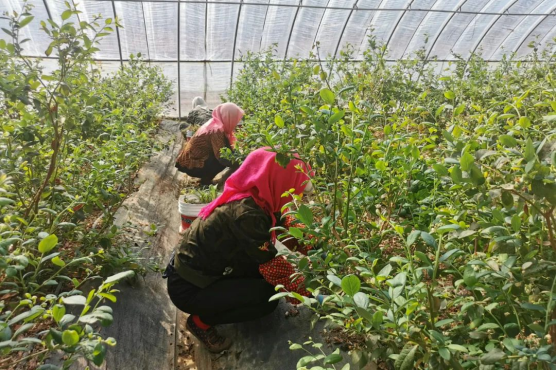 在大庙镇鞠杖子村农业产业园的蓝莓种植大棚中,工作人员正在除草、疏花疏果。该农业产业园共占地面积约150亩,一、二期种植蓝莓、豆角、尖椒的18栋大棚已投入使用,3期工程预计建棚13栋,产业园长期雇佣人员有16人,短期雇佣人员10人。